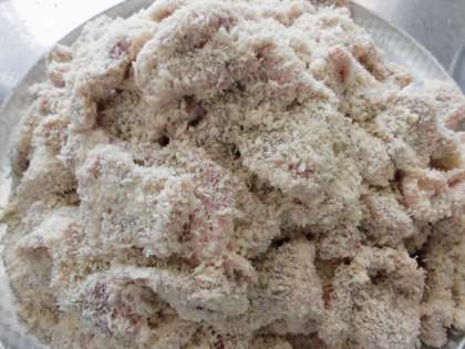 塩・こしょうをした豚肉一枚一枚に,小麦粉,衣,パン粉を丁寧につけていきました。明親小学校は約410人分なので24kgの豚肉の準備をしました。