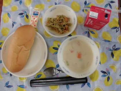 3月16日(火)の献立は,コッペパン(国内産小麦100%)・牛乳・ツナごぼうサンド(具)・チャウダーでした。