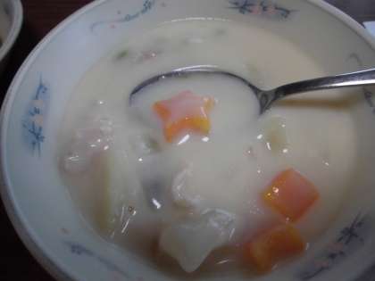 給食室からは「卒業おめでとうにんじん」をチャウダーにしのばせました。