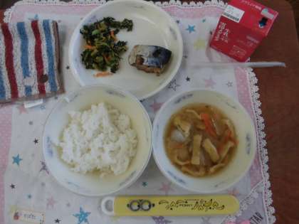 3月19日(金)の献立は,ごはん・牛乳・さばのしょうが煮・だいこん葉のごまいため・いものこ汁でした。