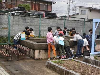 学年園のそばにある観察池には,どんな生き物がいるのかと,みんなでのぞいていたり,校舎の裏側の草花をじっくり見て観察カードに書いたりしました。