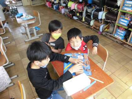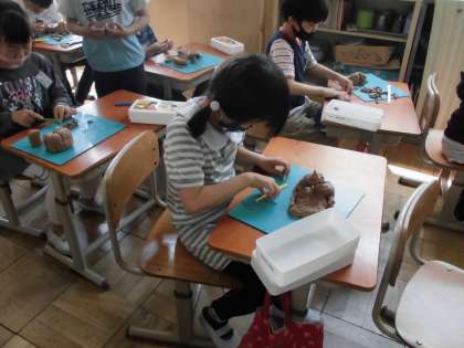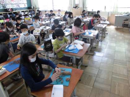 0422 3年生 図工「切って かきだして くっつけて」で粘土を使いました!! 公開日 2021/04/22 更新日 2021/04/22 3年生 ヘラや糸を使って,粘土を切ったりかきだしたりして,楽しく作品づくりをしました。今回は,用具を使おうというめあてで,学習しました。 子どもたちは,お城やすべり台など,作りたいものを思い浮かべて,思い思いに作品を作りました。 授業の終わりには,友達と作品交流をして,工夫したところを紹介しました。