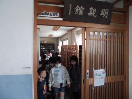 写真は,明親館,音楽室,放送室などを回っているところです。