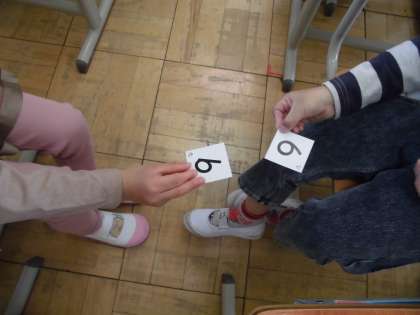 算数の「かずとすうじ」の学習で,10までの数の大小を比べるゲームを二人組でしました。
