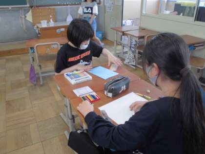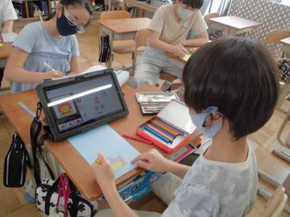チェックカードにキャンプファイヤーの絵を描いたり,かわいいシールを貼ったりしました。