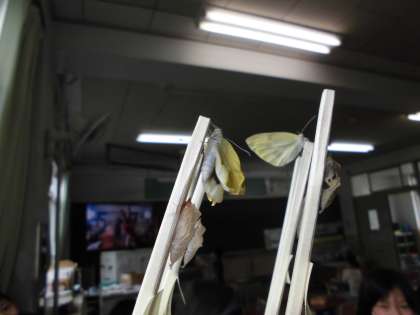 1時間目の授業の前に,羽化したチョウを窓から逃がそう・・・としていると。
