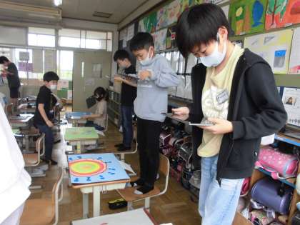 図画工作の学習で完成させた作品をタブレットのカメラ機能で撮影し,みんなで共有しました。