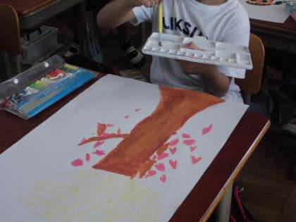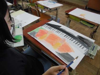 気持ちに合う形や色を工夫しながら,気持ちや様子が絵に表れるように,描いています。