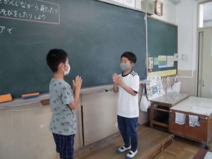 直接手を合わせませんが,交互に手を打つ動きをして楽しみます。相手との間を合わせながら,手拍子遊びをして「茶つみ」を学習しました。