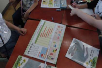 野菜がどんどん育ってきて,収穫できる子も出てきました。これから,もっとたくさんの実を収穫するためにどうすればよいか本を使って調べています。