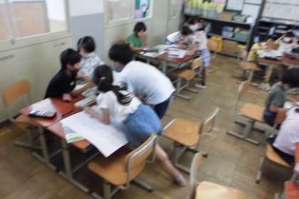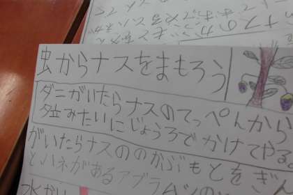 野菜の調べ学習もどんどん進んで取り組んでいます。「ダニが出てきたら・・・」「牛乳をかけると虫がでてこなくなるらしいで」「銀のアルミホイルをまくとアブラムシが出てこないらしい・・・」