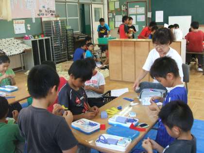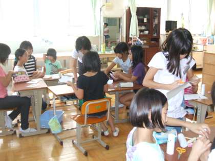 『若草まつり』に向けた事前学習として,毎年5・6年生が若草学級の子どもたちと一緒に共同学習を行います。9月14日(水)は,5校時に5年生1組の子どもたちが若草学級を訪れ,お守りや小物入れ・人形・メモ帳などを一緒に作りました。