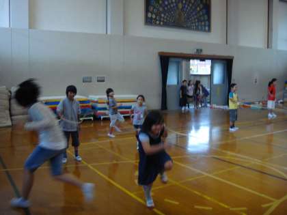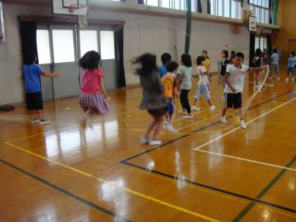 今日は雨のため、体育館で大縄飛びをしました。