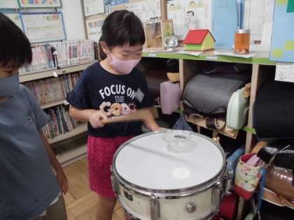 小太鼓を叩くとケースに入れたビーズが大きく跳ねたり,コップにつないだひもをこすると中に入ったビーズが大きく跳んだりしました。
