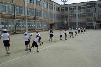 体育の学習でボールパスラリーをしています。5m離れたチームのメンバーにボールを投げ合い,一定時間にキャッチできた回数を競うゲームです。初めての時と比べると,投げ方が力強くなってきている子が増えました。