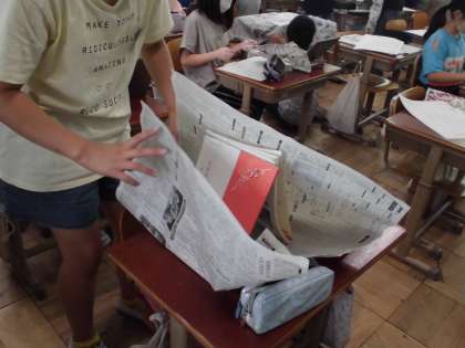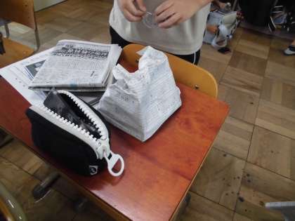 文房具や本,机やいすなど,身の回りにある物を新聞紙で包み,形の変化や触り心地などを楽しみました。