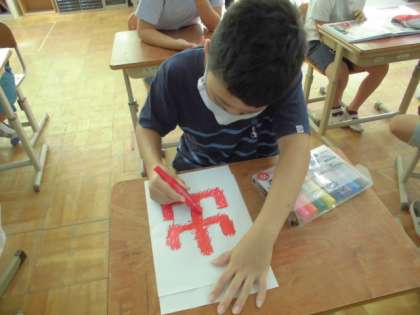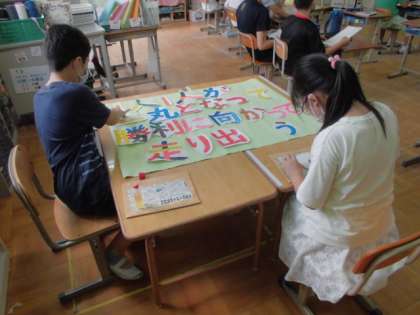 学級にもどり,みんなにスローガンの紹介をするために,大きなポスターを作りました。