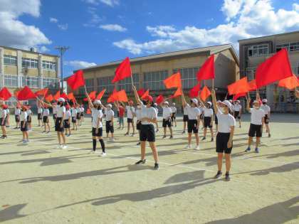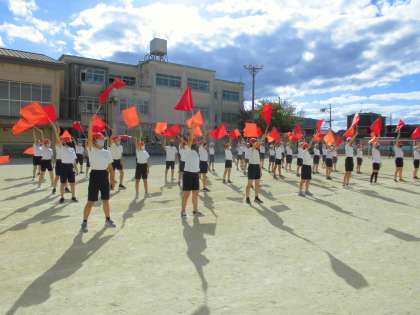 体育フェスティバル本番に使う新しいフラッグを使って運動場で練習しています。最後までの流れを確認しました。
