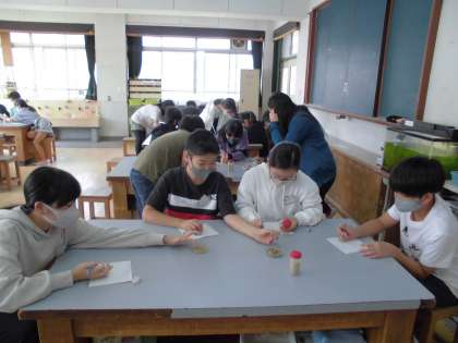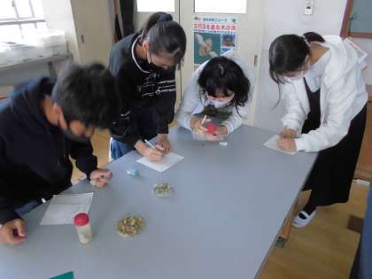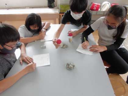 土地の断面に見られる模様は,何によってできているかを調べています。友だちと気が付いたことを話しながら,ワークシートに記入していました。
