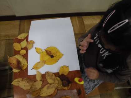 色が変わった落ち葉や虫に食われた落ち葉などがどのように見えるかを考えて,自分だけの落ち葉アートを作っていました。