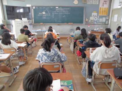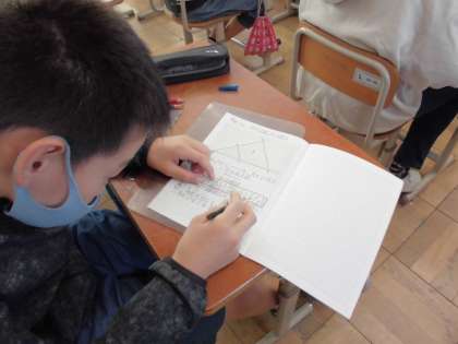 「図形の拡大と縮小」の学習です。今日は,1つの頂点を中心として拡大図や縮図のかき方を考えました。書き方の手順が分かると,コンパスを上手につかって作図しています。