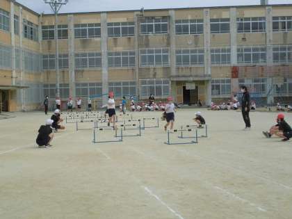 5年生が走る時には6年生が,6年生が走る時には5年生が,ハードル位置の調整をします。みんなゴールまで力いっぱい走りました。