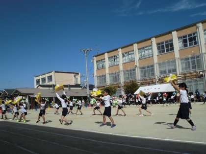 体育フェスティバル「花ひらけ!花がさロック」の演技の様子です。練習の成果を発揮して,笑顔で踊ることができました。
