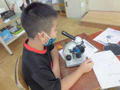 顕微鏡をのぞきながら,プリントに絵や言葉で記録しました。