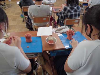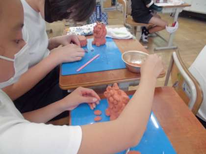 1027 6年 図工 公開日 2021/10/27 更新日 2021/10/27 6年生 「オリジナルのシーサーを作ろう」 土粘土風の粘土の感触を楽しみながら,シーサーを作りました。 久しぶりの粘土を使っての制作活動にみんな嬉しそうでした。 友だちと協力して粘土を針金で分けるところから始めました。
