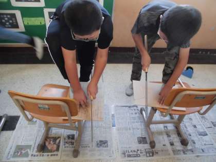 1028 4年生 図画工作 公開日 2021/10/28 更新日 2021/10/28 4年生 「ギコギコトントンクリエイター」の学習です。 設計したアイデアスケッチをもとに,のこぎりを使って木材を切り,いろいろな形を組み合わせて,楽しく日常生活で使えるものを作ります。 今日は,初めてののこぎりに挑戦しました。使い方や安全に十分配慮して,木を切っていきました。なかなか思うように刃を進めることができず,苦戦していましたが,一生懸命取り組んでいます。 どんな作品ができるか楽しみです。