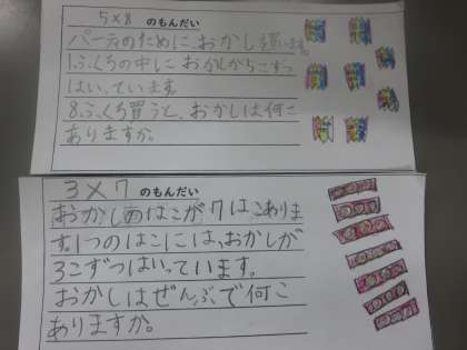 1029 2年 算数 かけ算の問題づくり 公開日 2021/10/29 更新日 2021/10/29 2年生 かけ算の学習で問題づくりを行いました。「1つ分の数は・・・」「いくつ分は・・・」と,学習したことを活かして問題を作っていました。 何問かは宿題に出す予定です。自分が作った問題は宿題になるでしょうか?楽しみです。