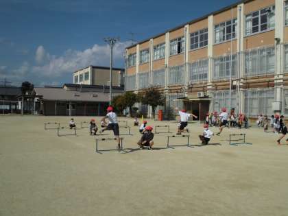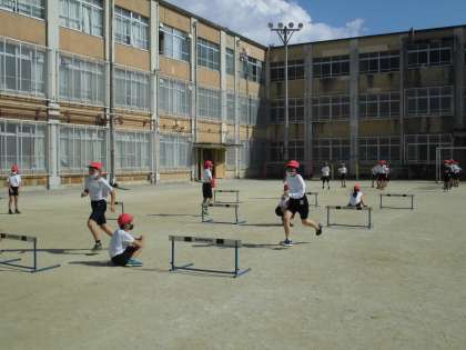 1102 4年生 体育 公開日 2021/11/02 更新日 2021/11/02 4年生 「ハードル走」の学習です。 「トン・1・2・3」のリズムで跳ぶこと,ハードルから少し離れたところから踏み切ること,上半身を少し倒して跳ぶことなど・・・。 たくさんのことを意識しながら走りました。 今日は3回目だったので,少し慣れてきた様子で,初めての時よりどんどんスピードが上がってきています。 これまでは,3台のハードルでしたが,次回からは1台増やしてチャレンジしていきます。