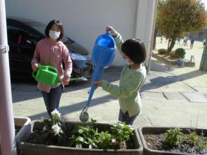 環境委員会では,朝休みや昼休みに,プランターの花に水やりをしています。