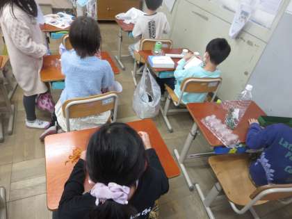 今日は「音づくりフレンズ」の学習で,材料からどんな音がでるか「お気に入りの音探し」をしました。