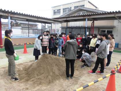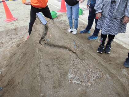 山の頂上から流れる水の様子を観察しました。カーブをえがいた川の内側と外側では流れる水はどのように変わるのか,また流れついた堆積物の様子はどのような様子かを歓声をあげながら観察していました。