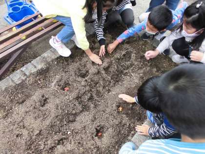 チューリップの球根を植えました。教室では,色や手触り,大きさをよく見て観察カードに記録しました。しっかり観察できているかな?その後に畑に移動し,優しく土をかぶせて皆で大きく育ってねと植えました。花が咲くのが楽しみですね。