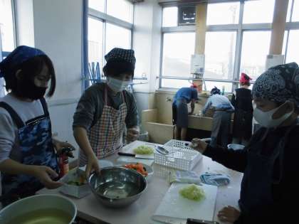 秋元先生や笘篠先生と一緒にわいわい調理していました。
