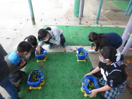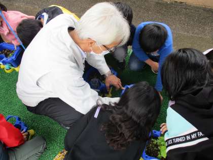 インタビューが終わった後,子どもたちが育てている野菜を実際に見ていただき,間引きのタイミングや葉の様子についてアドバイスをもらいました。