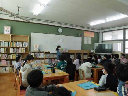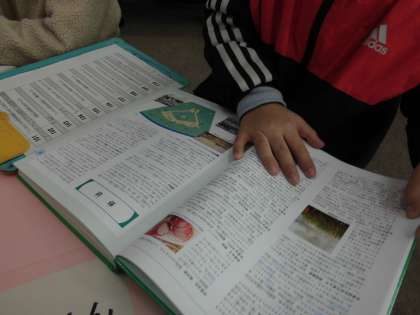 今日は学校図書館へ行き,学校司書の佐々木先生に,百科事典の使い方を教えてもらいました。