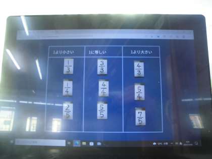 分子と分母の数を見比べて,1より小さい分数,1と等しい分数,1より大きい分数に仲間分けをしました。