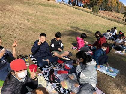 みんなでお弁当を食べています。芝生に座って気持ち良さそうです。