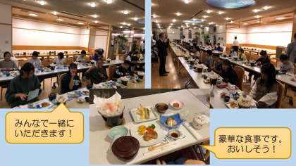 夕食の時間となりました。修学旅行の夕食は,おかずの量が多く,食べ応えがあります。とてもおいしそうです。ごはんのおかわりは自由で,手をあげると持ってきてくださいます。たくさん食べて,大満足です。