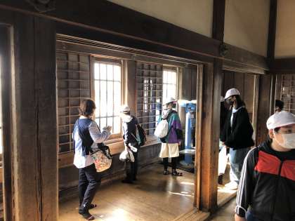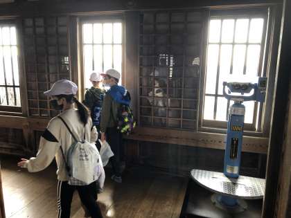 どんどん進んでいくと,大天守の最上階に到着しました。この大天守の最上階は6階の高さです。思っていた以上の高さで,外を見て驚いている様子が見られます。
