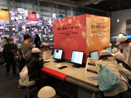 シアターでの映像の視聴が終わり,震災に関わる展示を見て学習をしています。