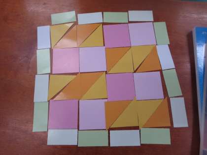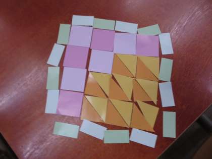 三角形と四角形の学習で,長方形と正方形,直角三角形を使って模様づくりを行いました。「きれいに色が変わった」「この形は・・・ここかな?」と,形に関心をもって学習に取り組んでいました。