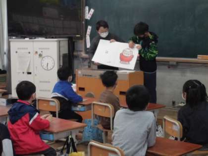 今週の読書週間に合わせて,図書委員会の5・6年生が1年生に読み聞かせに行きました。