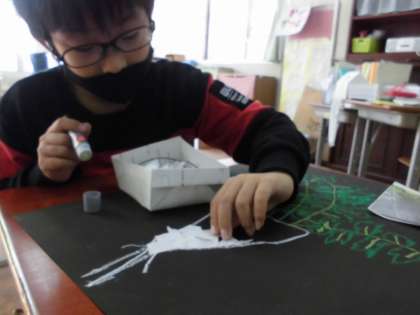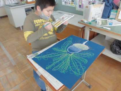 クレパスで線を描いた後,絵の具を使ったりちぎり絵をしたりして仕上げていきました。