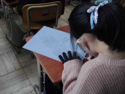 彫り終わった人たちから刷る作業に取り掛かっています。きれいに写すことができるか,彫った線はしっかり出ているかドキドキの瞬間です。「おー!」「ちゃんと写ってる!」と楽しそうな声がたくさん聞こえてきました。
