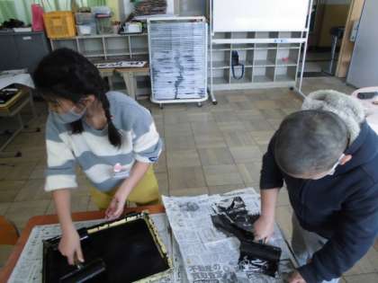 「生き物の世界」をテーマに,物語の1場面を判で作り,刷りました。自分の生き物の特徴を,いろんな素材で作り,それがうまく表現できるように工夫していました。