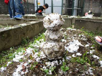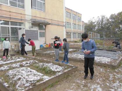 0124 若草学級 雪が降りました 公開日 2022/01/25 更新日 2022/01/25 若草学級 1月21日,雪が積もりました。 数センチですが,運動場にも,若草の畑にも雪が積もりました。 朝の会の後,「みんなで畑に行ってみよう!」 「やったあ!」 「つめたーい!」 「先生!お花にも積もってる!大丈夫かな?」 雪を集めたりボールのように丸めたり。 かじかむ手で作ったかわいい『オラフ』がやさしく微笑んでいました。